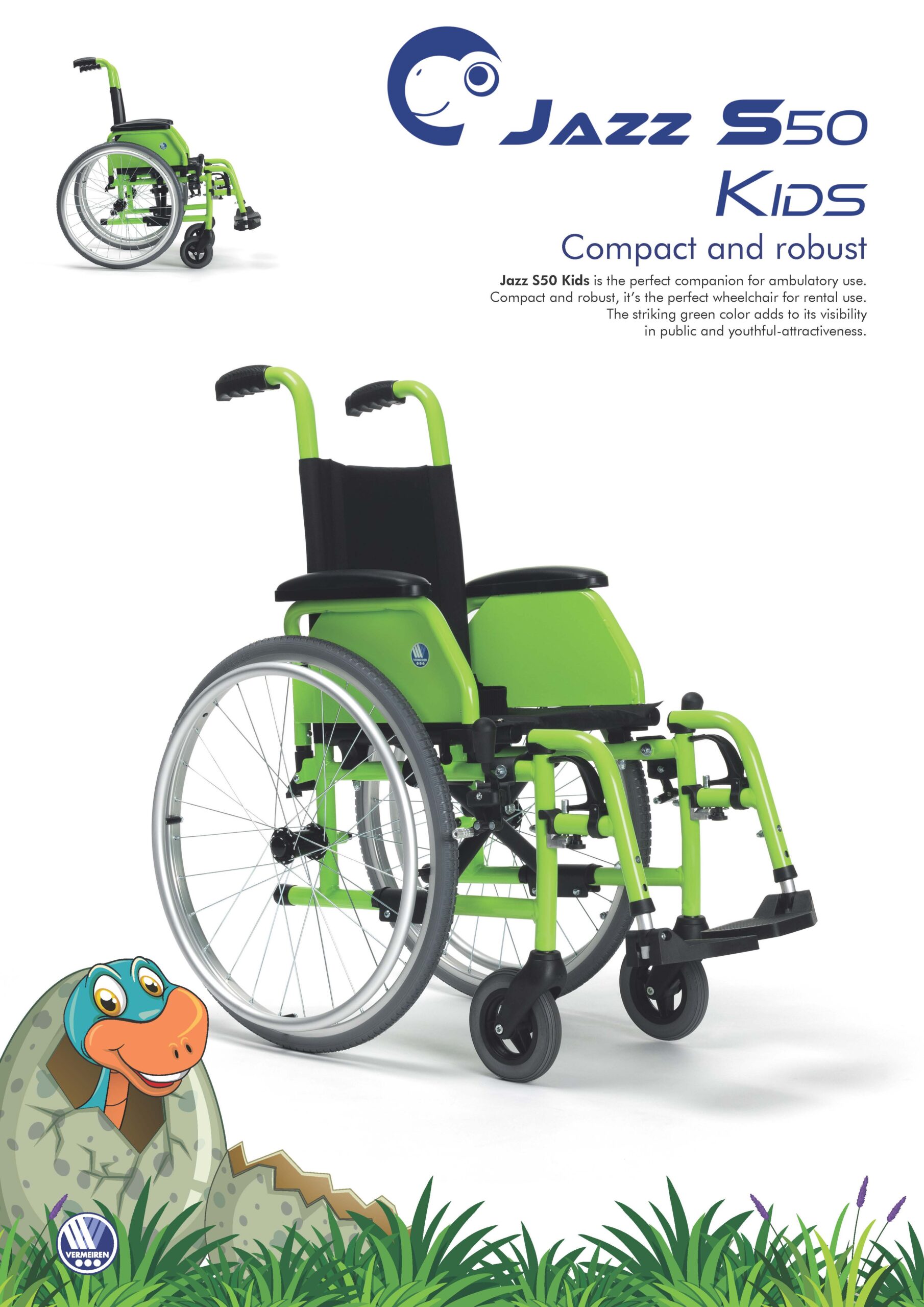 Vermeiren Jazz S50 Kids е адаптивна детска ръчна инвалидна количка, проектирана да расте заедно с вашето дете. Съчетаваща здрава сгъваема рамка с много широки възможности за регулиране, тя предлага максимален комфорт и безопасност.